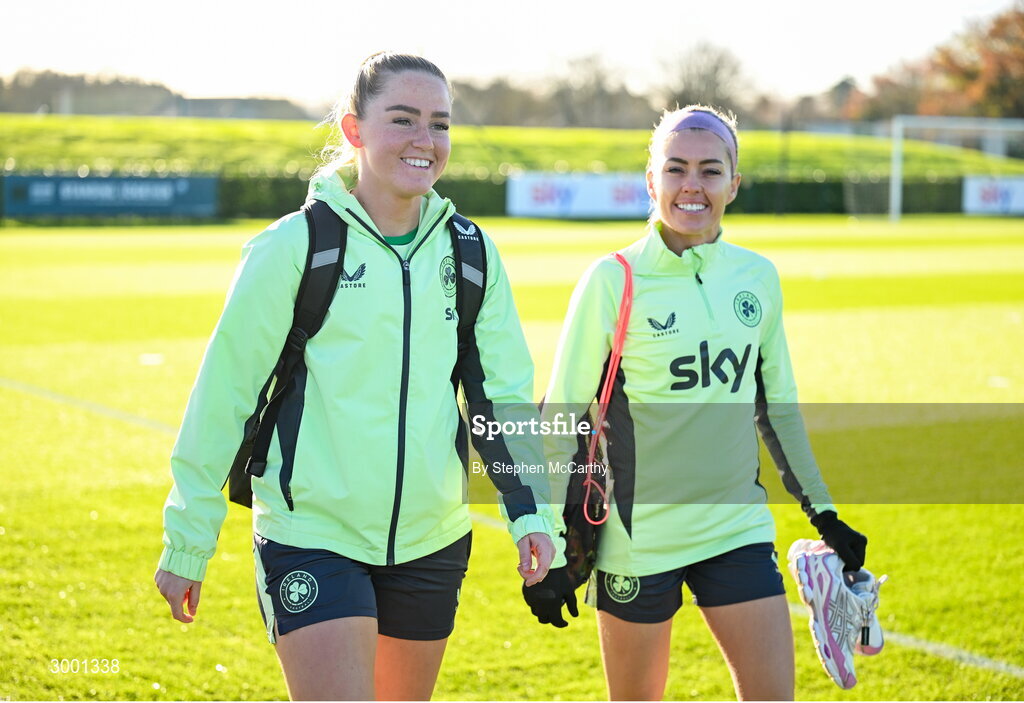26 November 2024; Jessie Stapleton and Denise O'Sullivan, right, arrive for a Republic of Ireland women training session at the FAI National Training Centre in Abbotstown, Dublin. Photo by Stephen McCarthy/Sportsfile