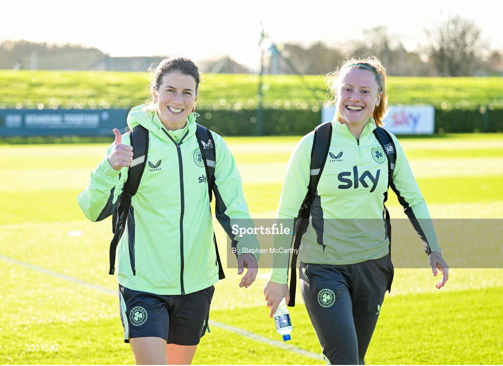 26 November 2024; Niamh Fahey, left, and Amber Barrett arrive for a Republic of Ireland women training session at the FAI National Training Centre in Abbotstown, Dublin. Photo by Stephen McCarthy/Sportsfile