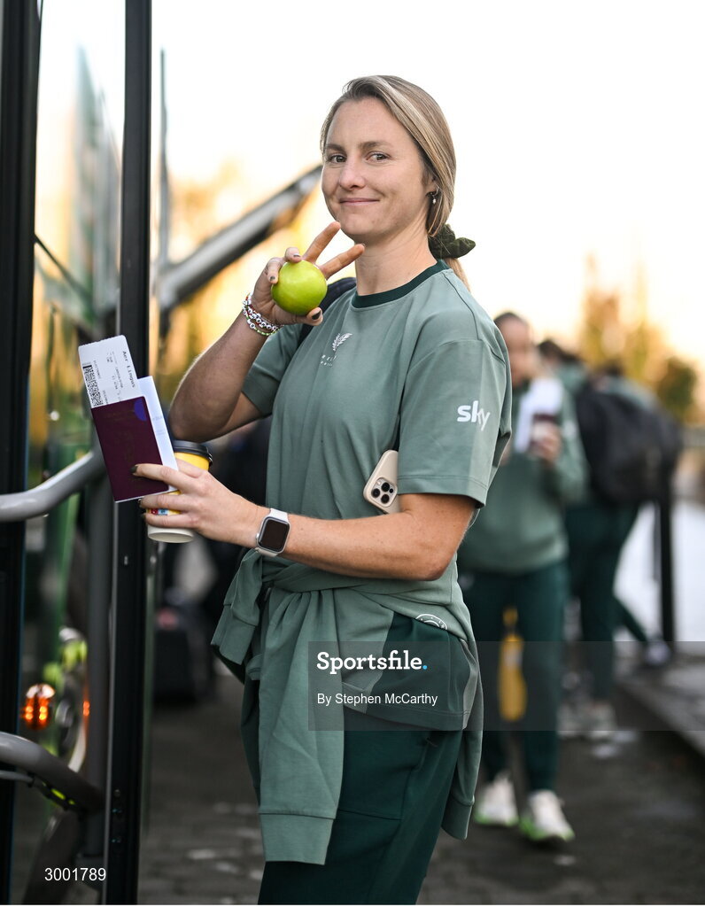 27 November 2024; Republic of Ireland's Kyra Carusa at their team hotel in Dublin ahead of the team's departure to Cardiff for their UEFA Women's EURO 2025 Play-off second round first leg match against Wales on Friday. Photo by Stephen McCarthy/Sportsfile
