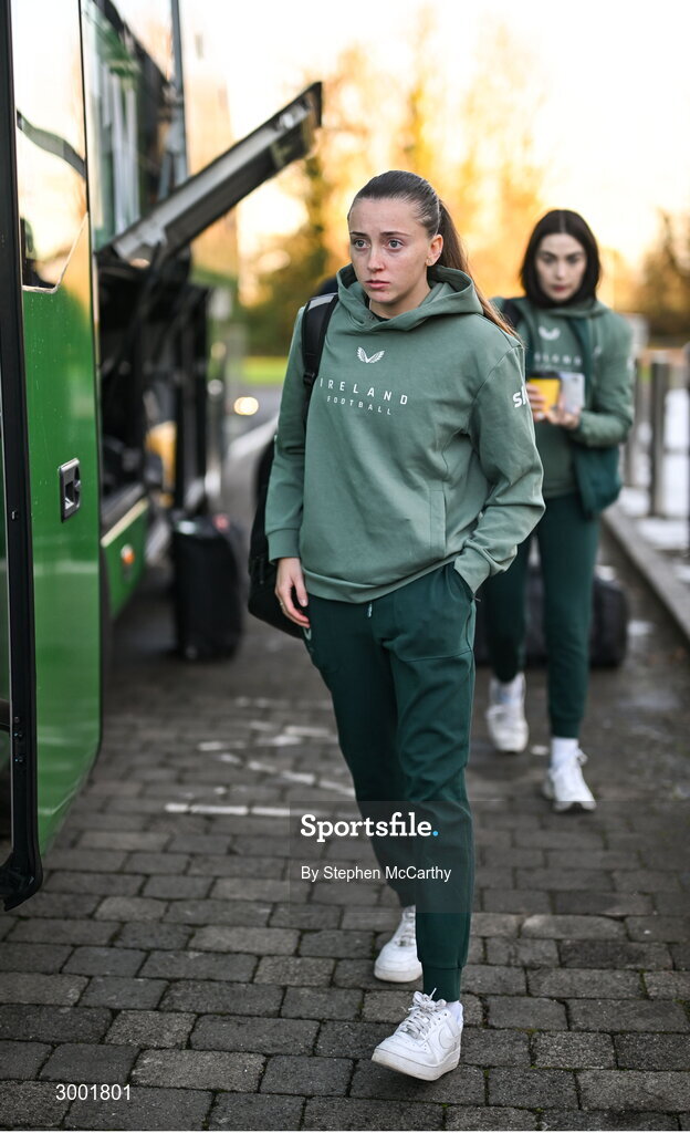 27 November 2024; Republic of Ireland's Abbie Larkin at their team hotel in Dublin ahead of the team's departure to Cardiff for their UEFA Women's EURO 2025 Play-off second round first leg match against Wales on Friday. Photo by Stephen McCarthy/Sportsfile