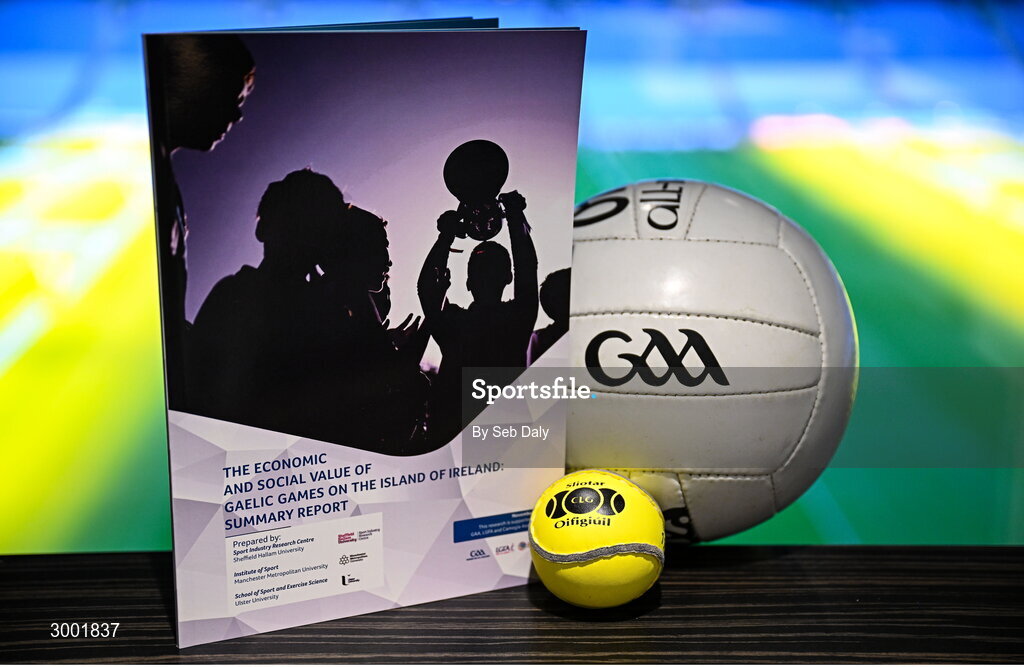 27 November 2024; A view of the Economic Impact and Social Value report on Gaelic Games, accompanied by a sliotar and football during the launch of the Economic Impact and Social Value report on Gaelic Games, at Croke Park in Dublin. Photo by Seb Daly/Sportsfile
