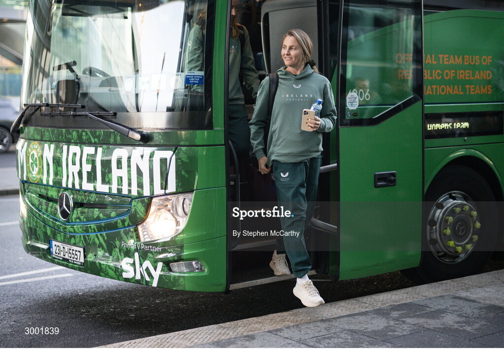 27 November 2024; Kyra Carusa of Republic of Ireland at Dublin Airport ahead of the team's departure to Cardiff for their UEFA Women's EURO 2025 Play-off round two first leg match against Wales on Friday. Photo by Stephen McCarthy/Sportsfile