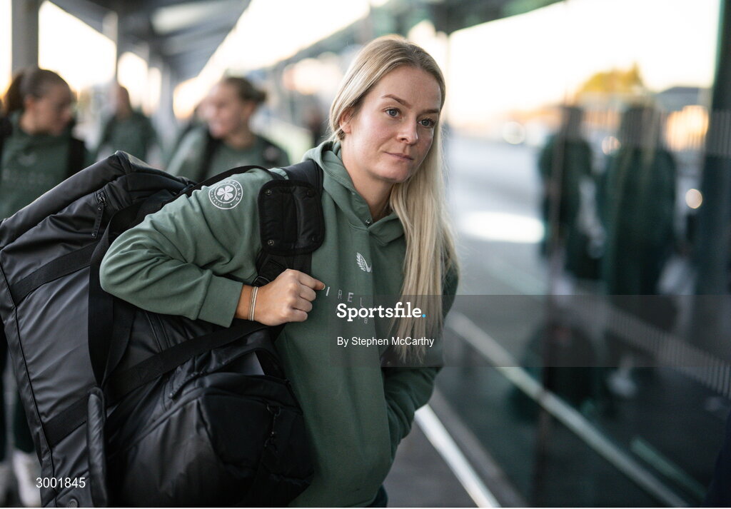 27 November 2024; Lily Agg of Republic of Ireland at Dublin Airport ahead of the team's departure to Cardiff for their UEFA Women's EURO 2025 Play-off round two first leg match against Wales on Friday. Photo by Stephen McCarthy/Sportsfile