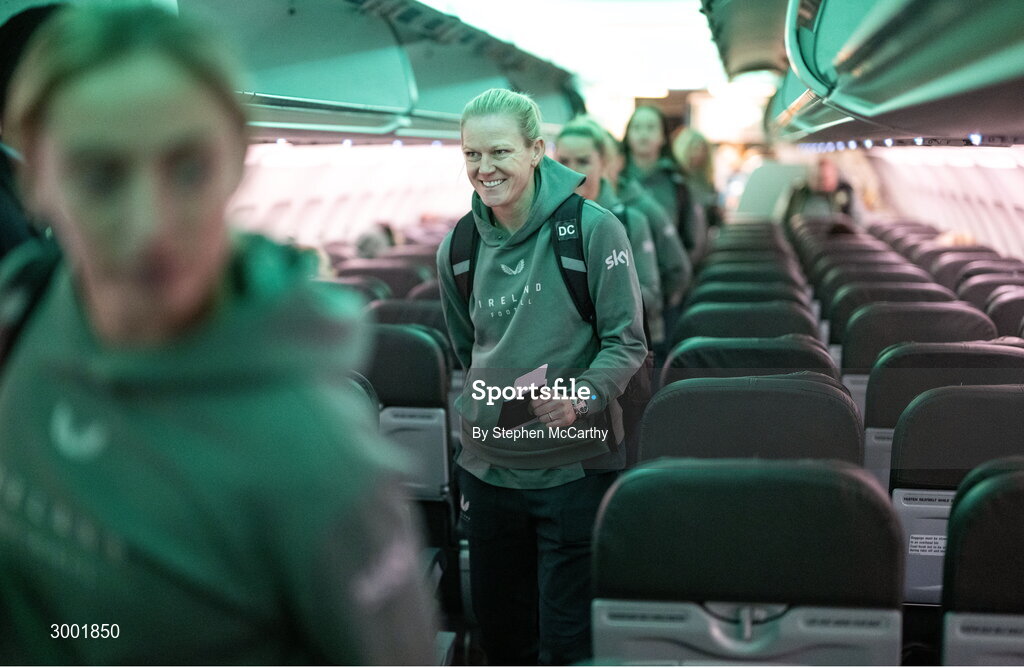 27 November 2024; Diane Caldwell of Republic of Ireland at Dublin Airport ahead of the team's departure to Cardiff for their UEFA Women's EURO 2025 Play-off round two first leg match against Wales on Friday. Photo by Stephen McCarthy/Sportsfile