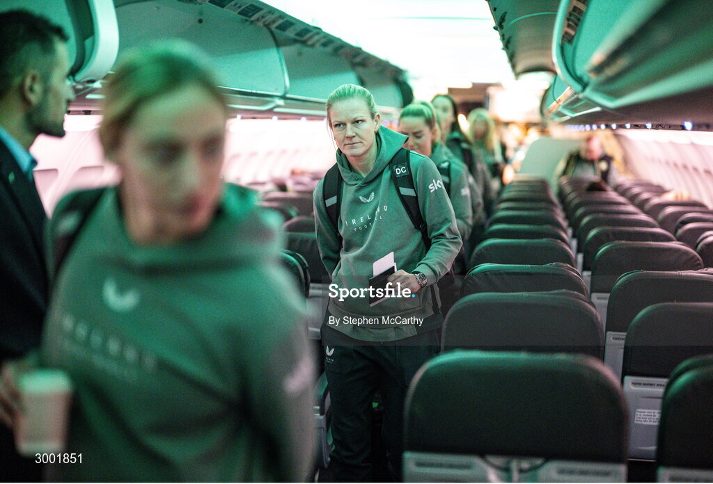 27 November 2024; Diane Caldwell of Republic of Ireland at Dublin Airport ahead of the team's departure to Cardiff for their UEFA Women's EURO 2025 Play-off round two first leg match against Wales on Friday. Photo by Stephen McCarthy/Sportsfile