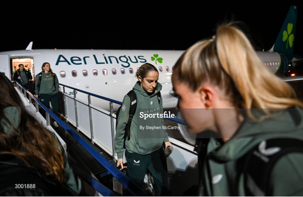 27 November 2024; Republic of Ireland's Julie-Ann Russell on the team's arrival at Cardiff Airport ahead of their UEFA Women's EURO 2025 Play-off second round first leg match against Wales on Friday. Photo by Stephen McCarthy/Sportsfile