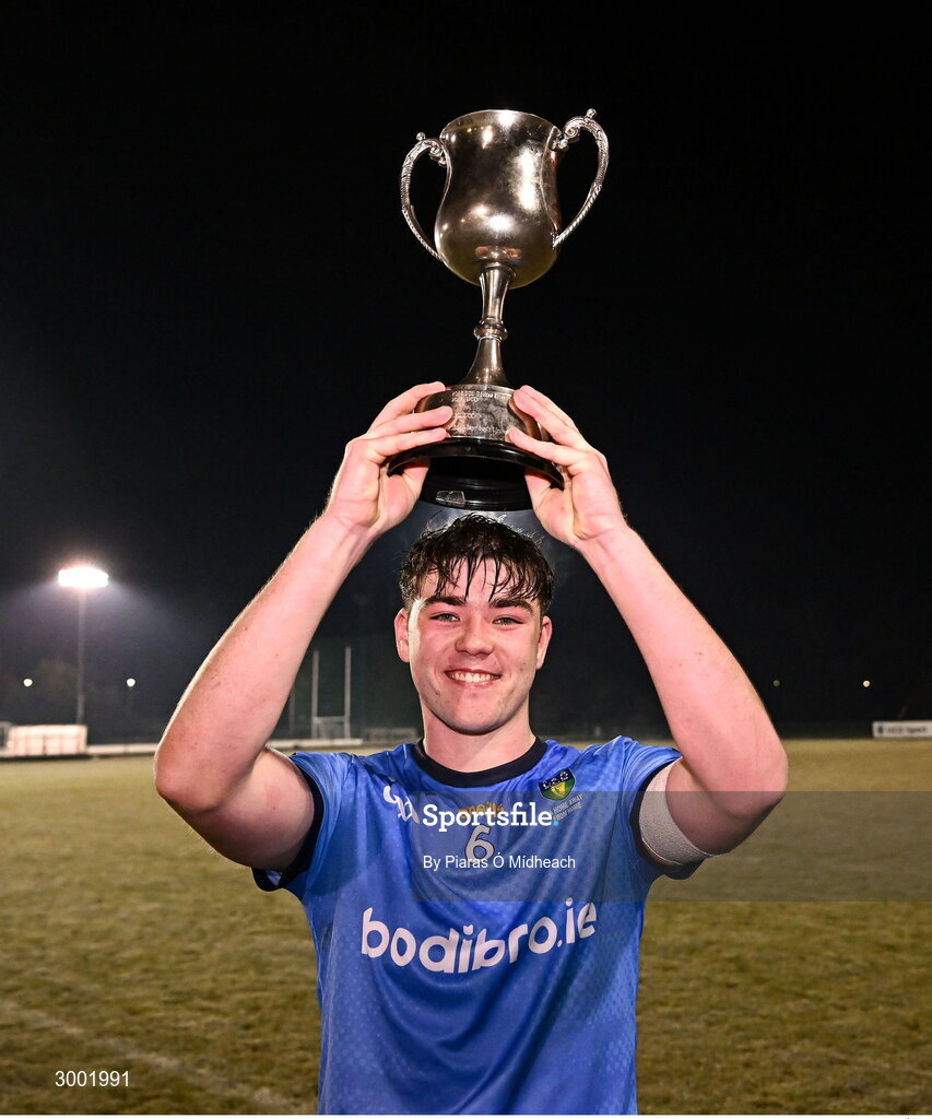 27 November 2024; UCD captain David O'Rourke lifts the cup after his side's victory in the HE GAA Freshers Football League Division 1 final match between UCD and UL at Billings Park in UCD, Dublin. Photo by Piaras Ó Mídheach/Sportsfile