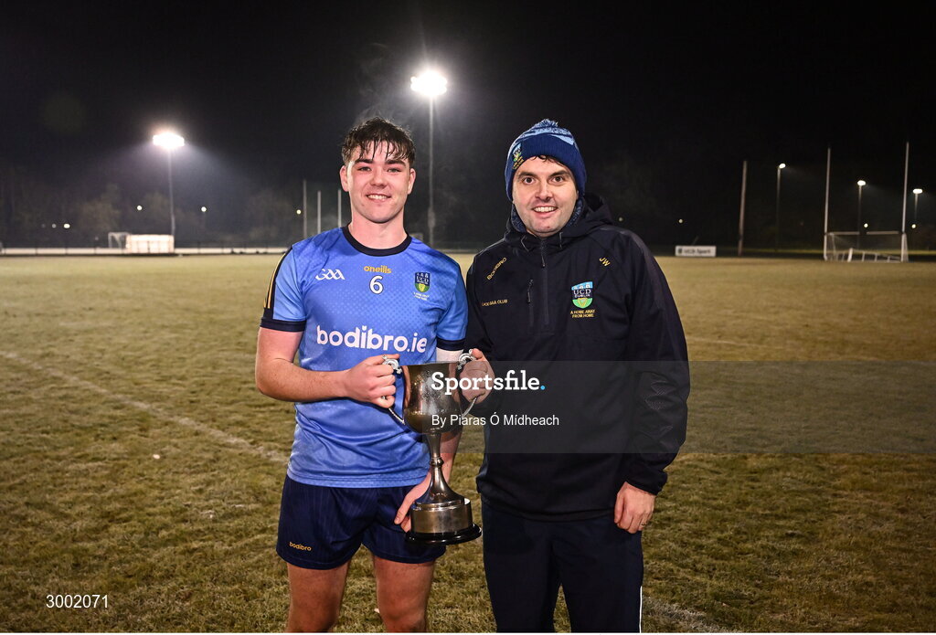 27 November 2024; UCD captain David O'Rourke and UCD GAA development officer Josh Warde celebrate with the cup after their side's victory in the HE GAA Freshers Football League Division 1 final match between UCD and UL at Billings Park in UCD, Dublin. Photo by Piaras Ó Mídheach/Sportsfile