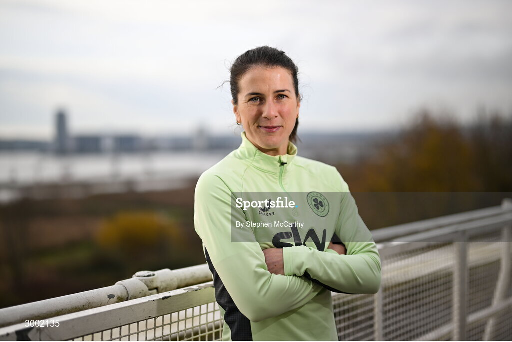 28 November 2024; Republic of Ireland's Niamh Fahey poses for a portrait at their team hotel ahead of their UEFA Women's EURO 2025 Play-off second round first leg match against Wales on Friday. Photo by Stephen McCarthy/Sportsfile