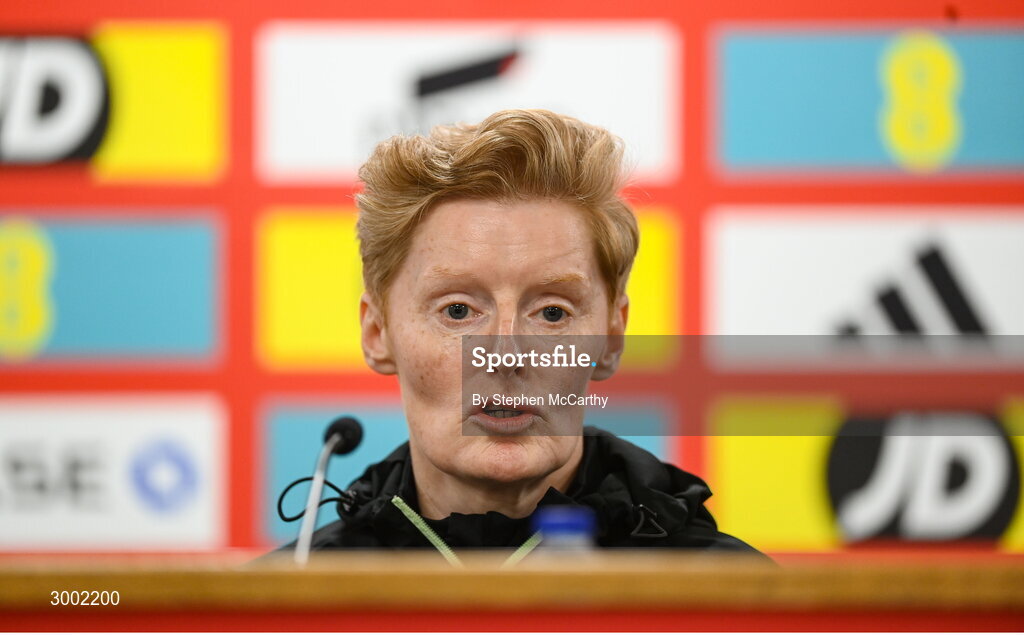 28 November 2024; Head coach Eileen Gleeson during a Republic of Ireland women press conference at Cardiff City Stadium in Wales. Photo by Stephen McCarthy/Sportsfile