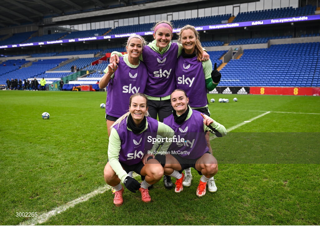 28 November 2024; Players, back row, Denise O'Sullivan, Caitlin Hayes, Kyra Carusa, with, Lily Agg and Izzy Atkinson during a Republic of Ireland women training session at Cardiff City Stadium in Wales. Photo by Stephen McCarthy/Sportsfile