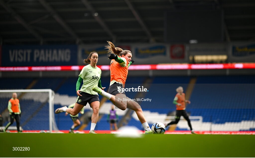 28 November 2024; Heather Payne and Anna Patten, left, during a Republic of Ireland women training session at Cardiff City Stadium in Wales. Photo by Stephen McCarthy/Sportsfile