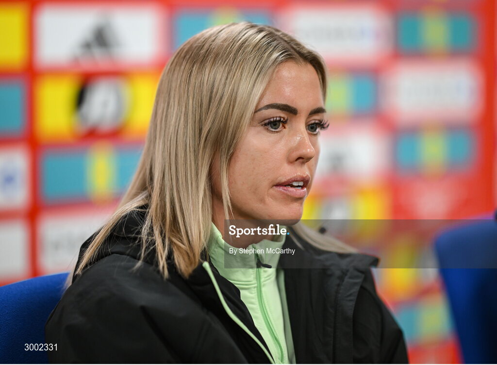 28 November 2024; Denise O'Sullivan during a Republic of Ireland women press conference at Cardiff City Stadium in Wales. Photo by Stephen McCarthy/Sportsfile