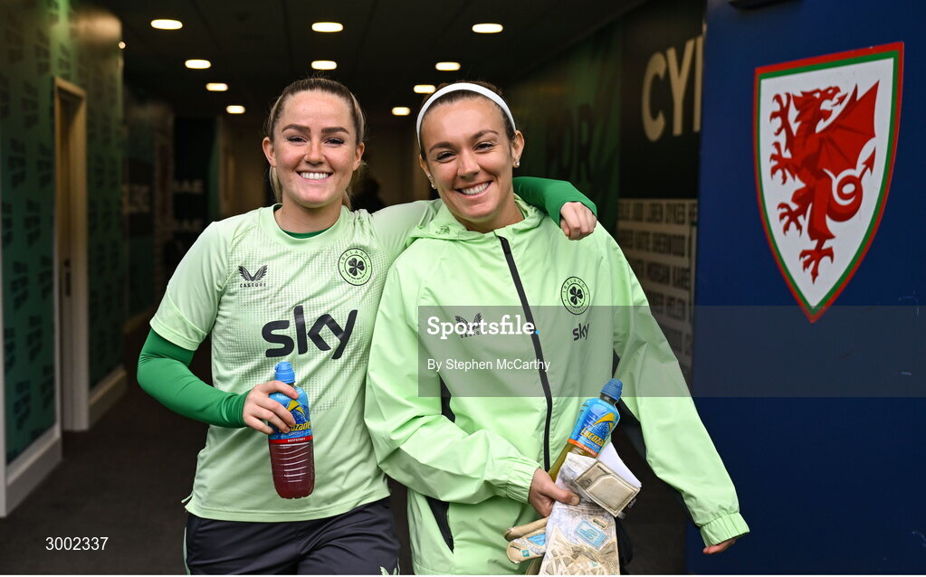 28 November 2024; Jessie Stapleton, left, and goalkeeper Grace Moloney during a Republic of Ireland women training session at Cardiff City Stadium in Wales. Photo by Stephen McCarthy/Sportsfile