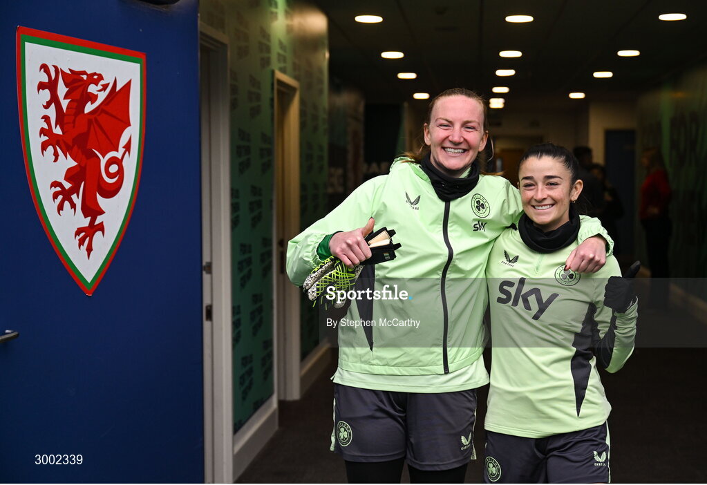 28 November 2024; Goalkeeper Courtney Brosnan, left, and Marissa Sheva during a Republic of Ireland women training session at Cardiff City Stadium in Wales. Photo by Stephen McCarthy/Sportsfile