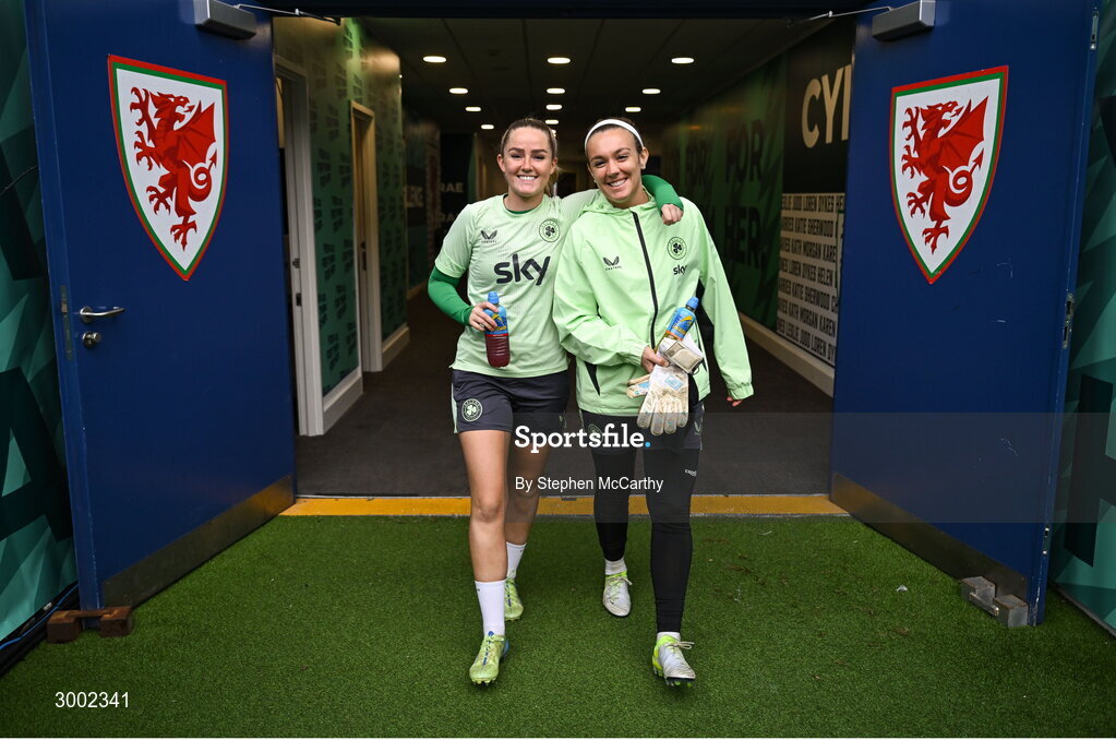 28 November 2024; Jessie Stapleton, left, and goalkeeper Grace Moloney during a Republic of Ireland women training session at Cardiff City Stadium in Wales. Photo by Stephen McCarthy/Sportsfile