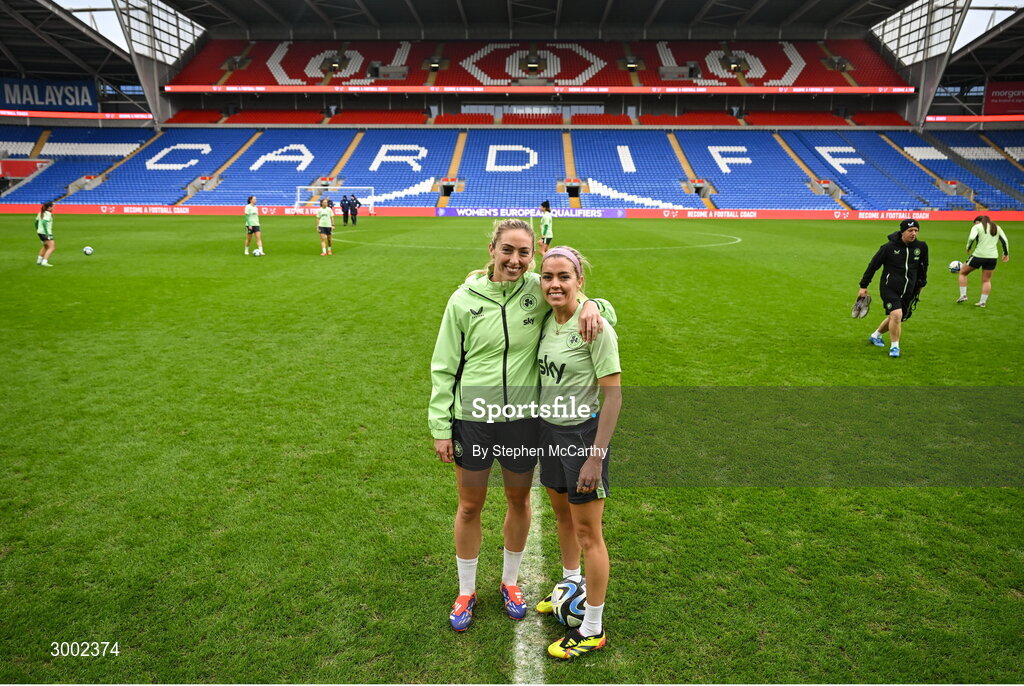 28 November 2024; Megan Connolly, left, and Denise O'Sullivan during a Republic of Ireland women training session at Cardiff City Stadium in Wales. Photo by Stephen McCarthy/Sportsfile