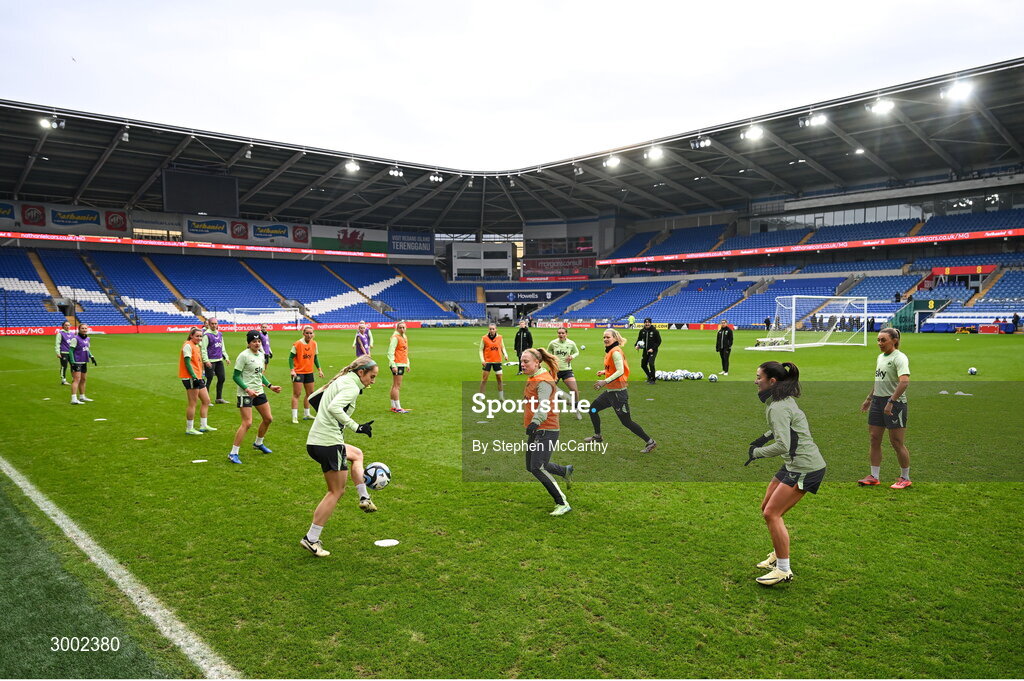 28 November 2024; A general view during a Republic of Ireland women training session, as Julie-Ann Russell takes possession, at Cardiff City Stadium in Wales. Photo by Stephen McCarthy/Sportsfile