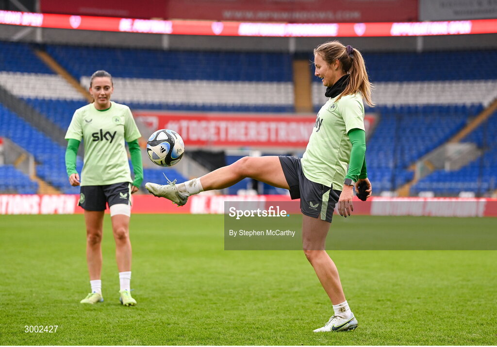 28 November 2024; Kyra Carusa and Abbie Larkin, left, during a Republic of Ireland women training session at Cardiff City Stadium in Wales. Photo by Stephen McCarthy/Sportsfile