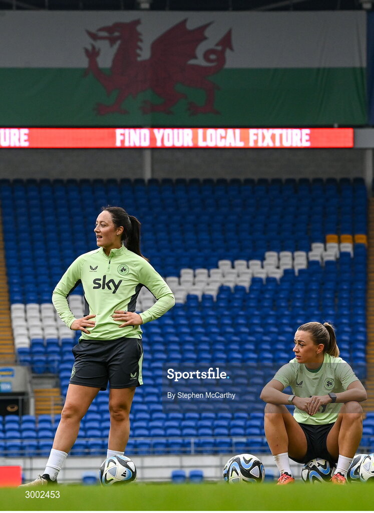 28 November 2024; Megan Campbell and Katie McCabe, right, during a Republic of Ireland women training session at Cardiff City Stadium in Wales. Photo by Stephen McCarthy/Sportsfile