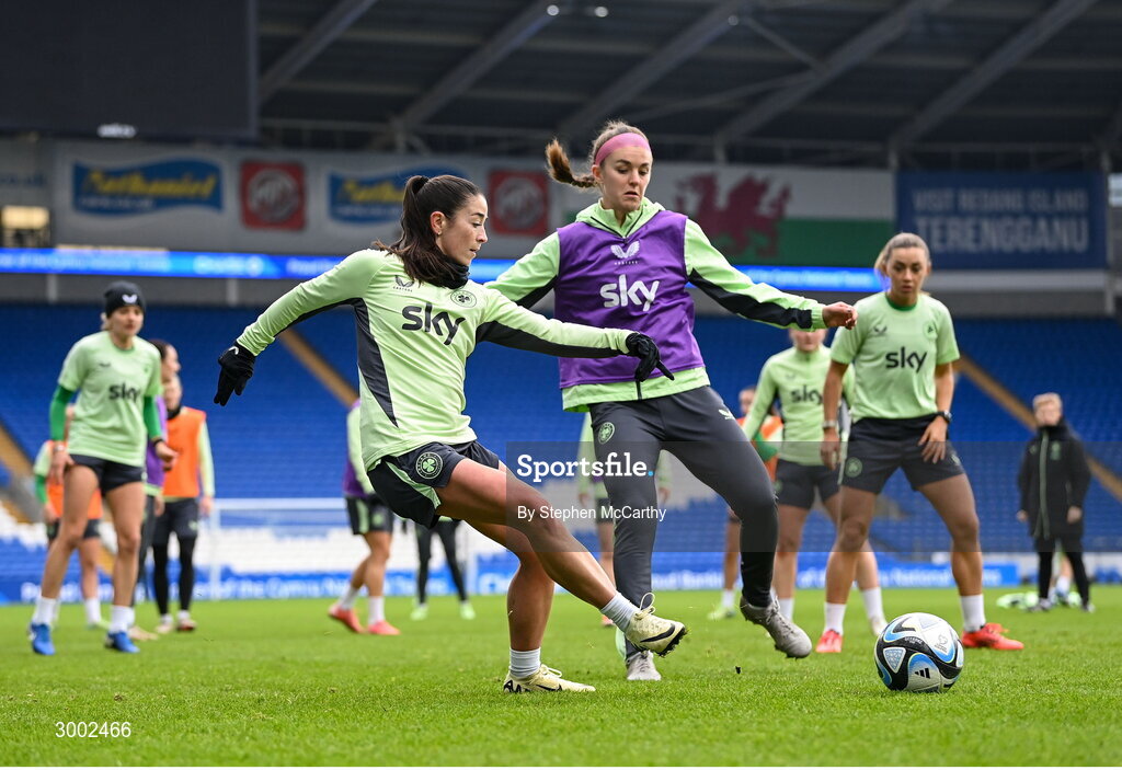 28 November 2024; Marissa Sheva and Caitlin Hayes during a Republic of Ireland women training session at Cardiff City Stadium in Wales. Photo by Stephen McCarthy/Sportsfile