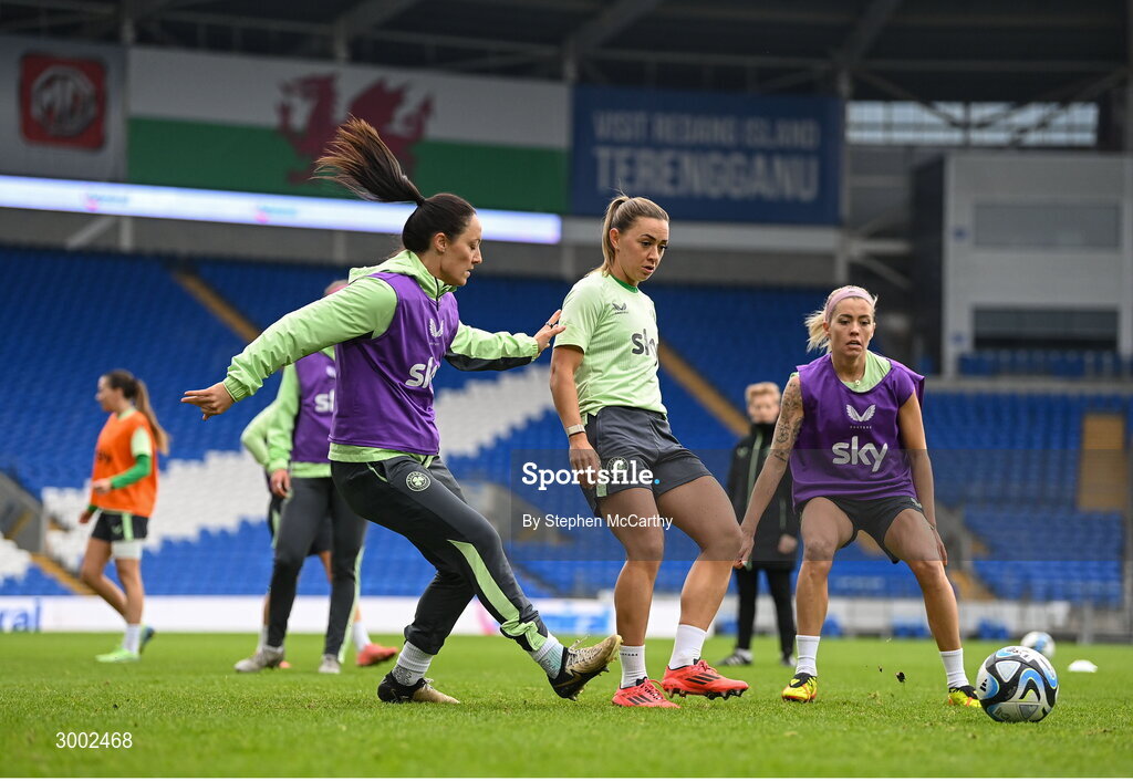 28 November 2024; Katie McCabe with Megan Campbell, left, and Denise O'Sullivan, right, during a Republic of Ireland women training session at Cardiff City Stadium in Wales. Photo by Stephen McCarthy/Sportsfile