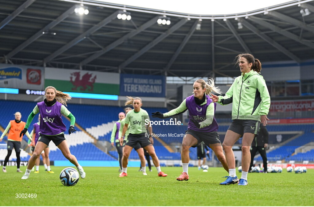 28 November 2024; Niamh Fahey, right, during a Republic of Ireland women training session at Cardiff City Stadium in Wales. Photo by Stephen McCarthy/Sportsfile