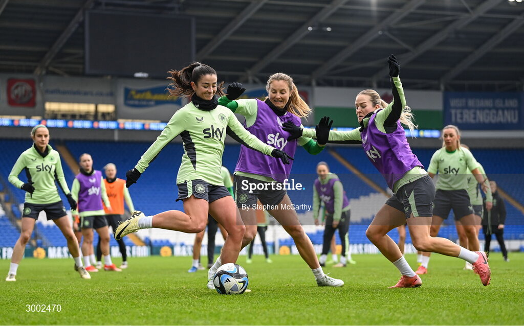 28 November 2024; Marissa Sheva, left, with Kyra Carusa and Lily Agg, right, during a Republic of Ireland women training session at Cardiff City Stadium in Wales. Photo by Stephen McCarthy/Sportsfile
