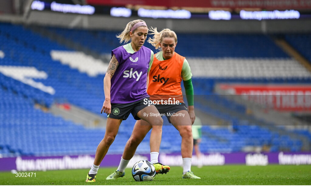 28 November 2024; Denise O'Sullivan and Jessie Stapleton, right, during a Republic of Ireland women training session at Cardiff City Stadium in Wales. Photo by Stephen McCarthy/Sportsfile