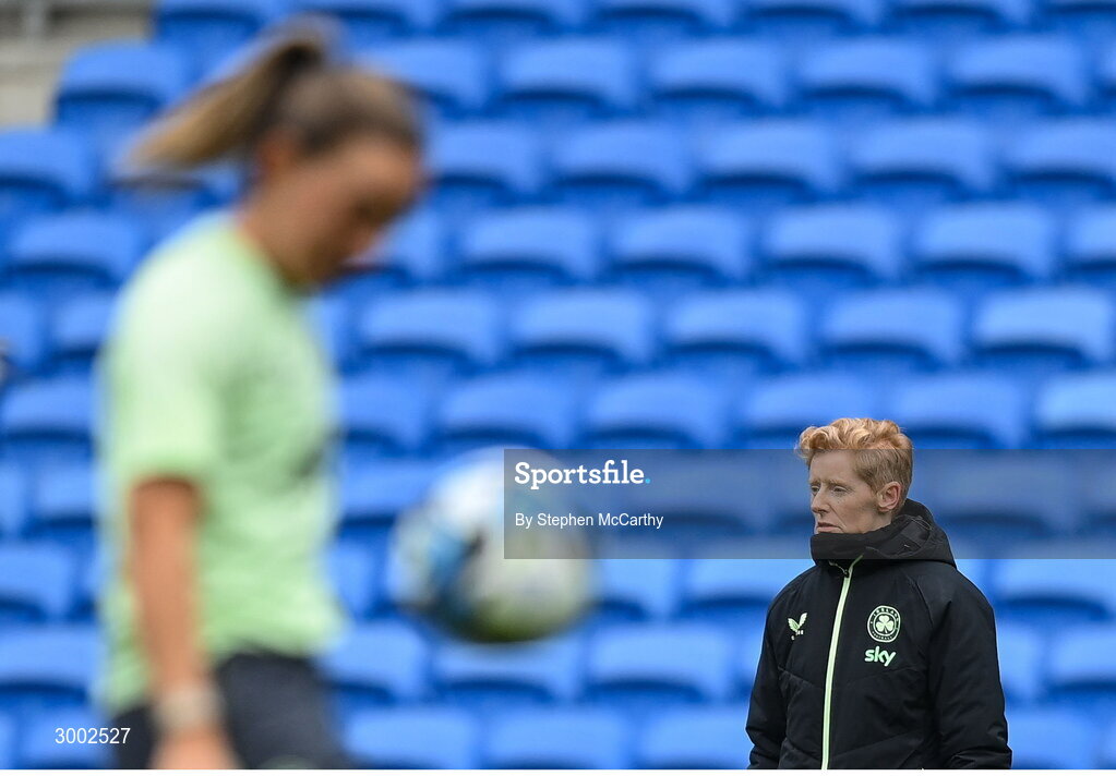 28 November 2024; Head coach Eileen Gleeson and Katie McCabe during a Republic of Ireland women training session at Cardiff City Stadium in Wales. Photo by Stephen McCarthy/Sportsfile