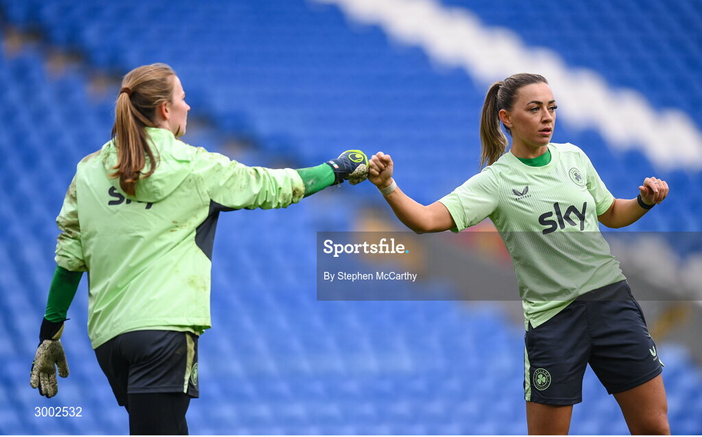 28 November 2024; Katie McCabe and goalkeeper Courtney Brosnan, left, during a Republic of Ireland women training session at Cardiff City Stadium in Wales. Photo by Stephen McCarthy/Sportsfile