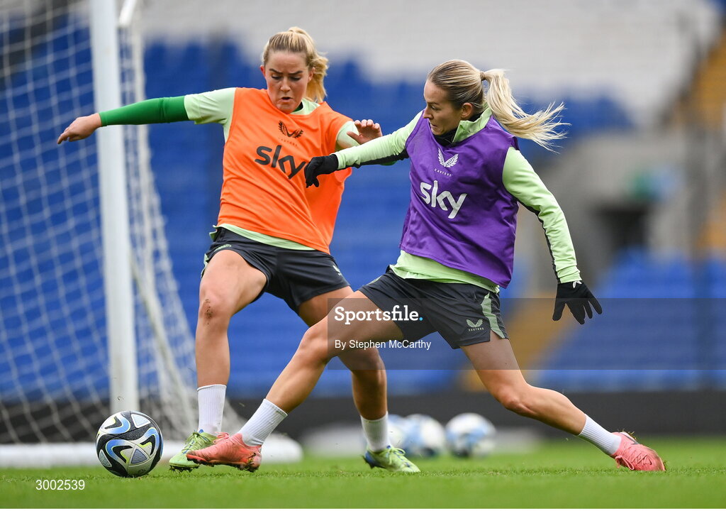 28 November 2024; Lily Agg and Jessie Stapleton, left, during a Republic of Ireland women training session at Cardiff City Stadium in Wales. Photo by Stephen McCarthy/Sportsfile