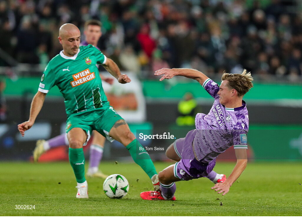 28 November 2024; Lukas Grgic of SK Rapid in action against Daniel Cleary of Shamrock Rovers during the UEFA Conference League 2024/25 league phase match between SK Rapid and Shamrock Rovers at the Allianz Stadion in Vienna, Austria. Photo by Tom Seiss/Sportsfile