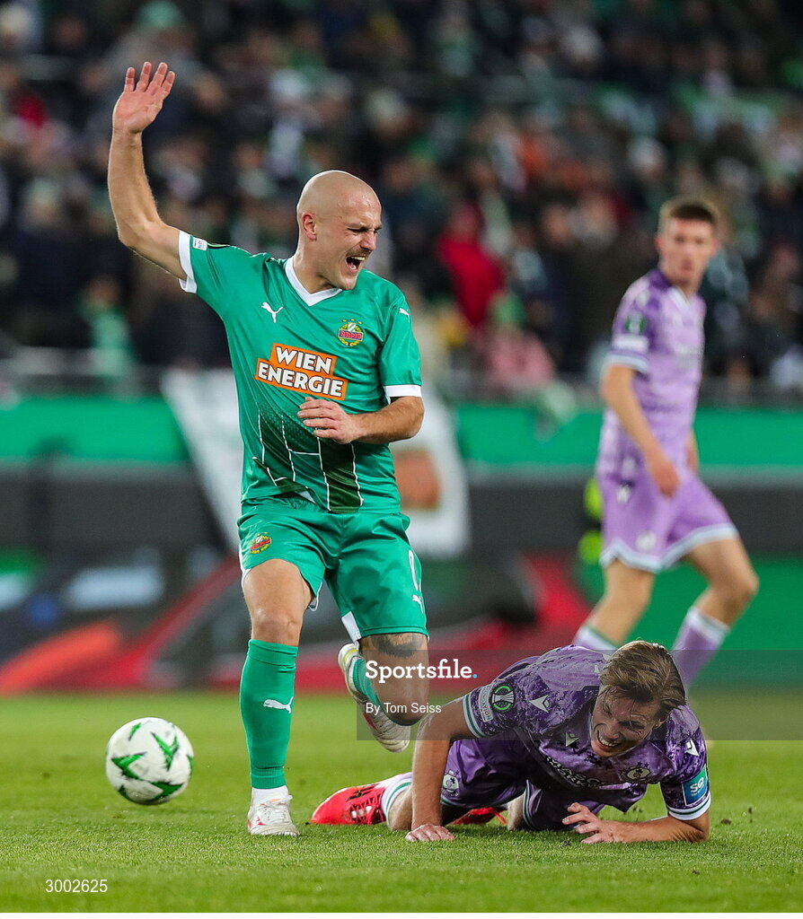 28 November 2024; Lukas Grgic of SK Rapid in action against Daniel Cleary of Shamrock Rovers during the UEFA Conference League 2024/25 league phase match between SK Rapid and Shamrock Rovers at the Allianz Stadion in Vienna, Austria. Photo by Tom Seiss/Sportsfile