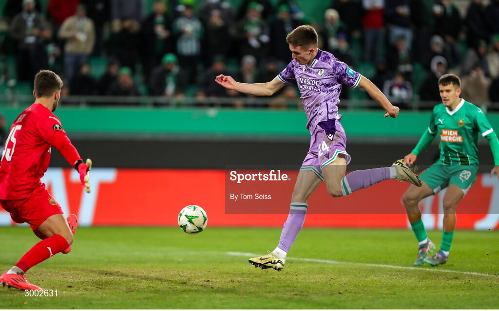 28 November 2024; Johnny Kenny of Shamrock Rovers shoots to score his side's first goal during the UEFA Conference League 2024/25 league phase match between SK Rapid and Shamrock Rovers at the Allianz Stadion in Vienna, Austria. Photo by Tom Seiss/Sportsfile