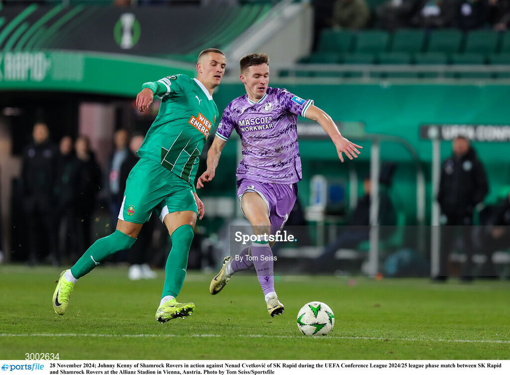 28 November 2024; Johnny Kenny of Shamrock Rovers in action against Nenad Cvetkovic of SK Rapid during the UEFA Conference League 2024/25 league phase match between SK Rapid and Shamrock Rovers at the Allianz Stadion in Vienna, Austria. Photo by Tom Seiss/Sportsfile