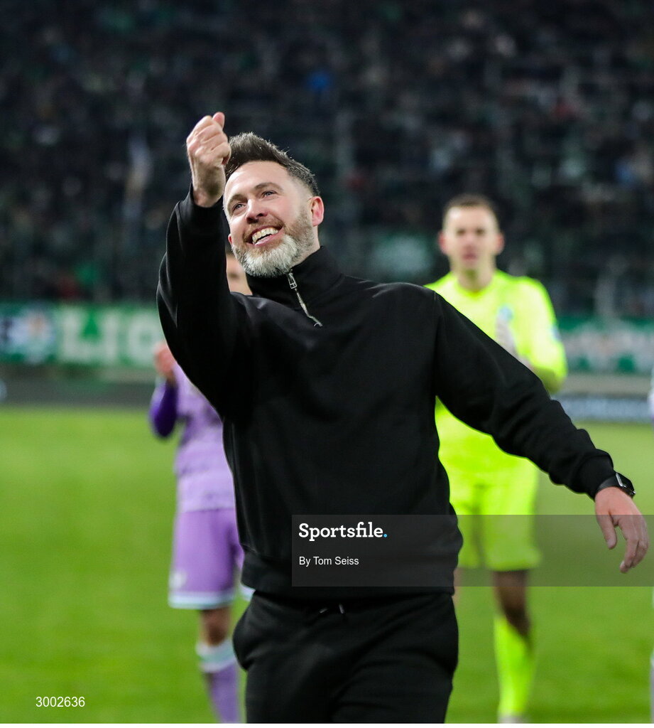 28 November 2024; Shamrock Rovers manager Stephen Bradley celebrates after the UEFA Conference League 2024/25 league phase match between SK Rapid and Shamrock Rovers at the Allianz Stadion in Vienna, Austria. Photo by Tom Seiss/Sportsfile