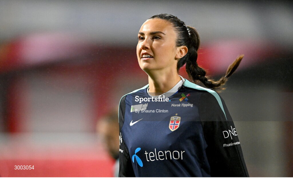 29 November 2024; Ingrid Engen of Norway warms up before the UEFA Women's EURO 2025 Play-off round two first leg match between Northern Ireland and Norway at Inver Park in Larne, Antrim. Photo by Shauna Clinton/Sportsfile