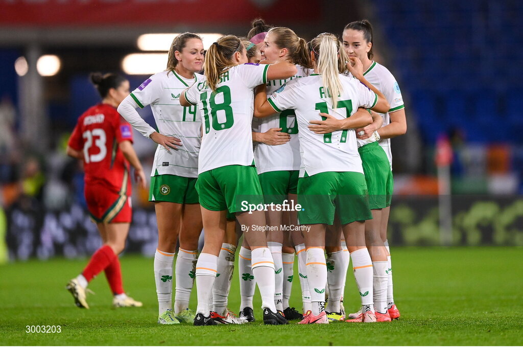29 November 2024; Republic of Ireland players celebrate their first goal, scored by Ruesha Littlejohn, centre, during the UEFA Women's EURO 2025 Play-off Round Two first leg match between Wales and Republic of Ireland at Cardiff City Stadium in Wales. Photo by Stephen McCarthy/Sportsfile