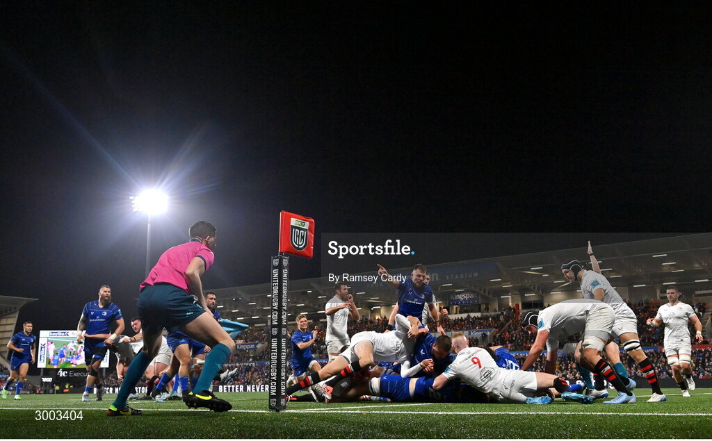 29 November 2024; James Culhane of Leinster, hidden, scores his side's fourth try during the United Rugby Championship match between Ulster and Leinster at Kingspan Stadium in Belfast. Photo by Ramsey Cardy/Sportsfile