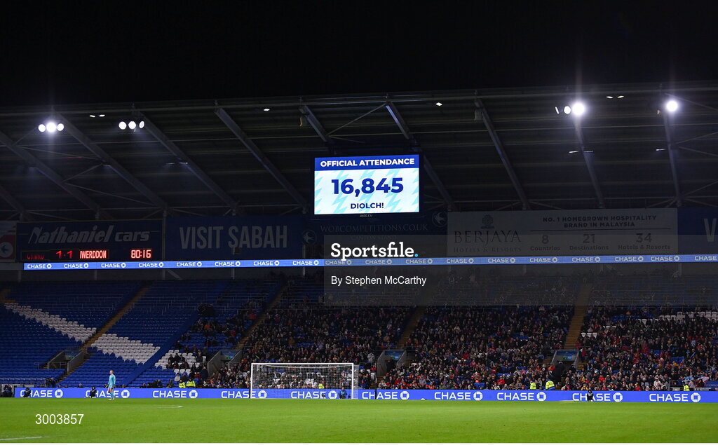 29 November 2024; A general view of Cardiff City Stadium as the big screen displays the attendance figure of 16,845 during the UEFA Women's EURO 2025 Play-off Round Two first leg match between Wales and Republic of Ireland at Cardiff City Stadium in Wales. Photo by Stephen McCarthy/Sportsfile