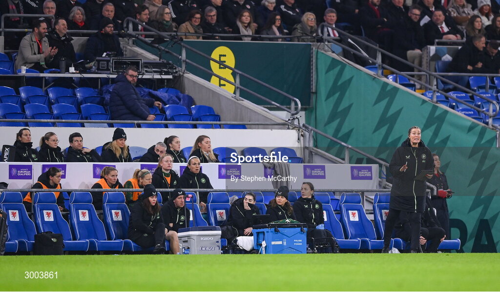 29 November 2024; Republic of Ireland assistant coach Emma Byrne during the UEFA Women's EURO 2025 Play-off Round Two first leg match between Wales and Republic of Ireland at Cardiff City Stadium in Wales. Photo by Stephen McCarthy/Sportsfile