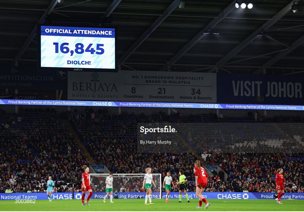 29 November 2024; The attendance is seen on the big screen during the UEFA Women's EURO 2025 Play-off Round Two first leg match between Wales and Republic of Ireland at Cardiff City Stadium in Wales. Photo by Harry Murphy/Sportsfile