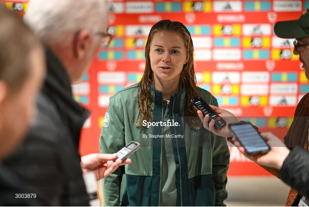 29 November 2024; Ruesha Littlejohn of Republic of Ireland speaks to media in the mixed zone after the UEFA Women's EURO 2025 Play-off Round Two first leg match between Wales and Republic of Ireland at Cardiff City Stadium in Wales. Photo by Stephen McCarthy/Sportsfile