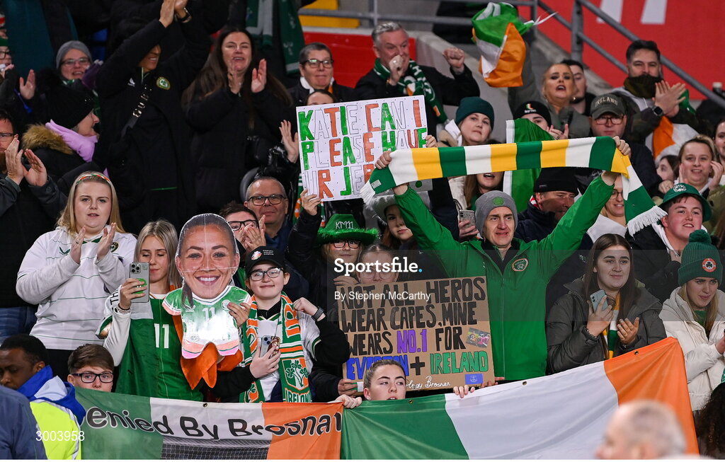 29 November 2024; Republic of Ireland supporters after the UEFA Women's EURO 2025 Play-off Round Two first leg match between Wales and Republic of Ireland at Cardiff City Stadium in Wales. Photo by Stephen McCarthy/Sportsfile