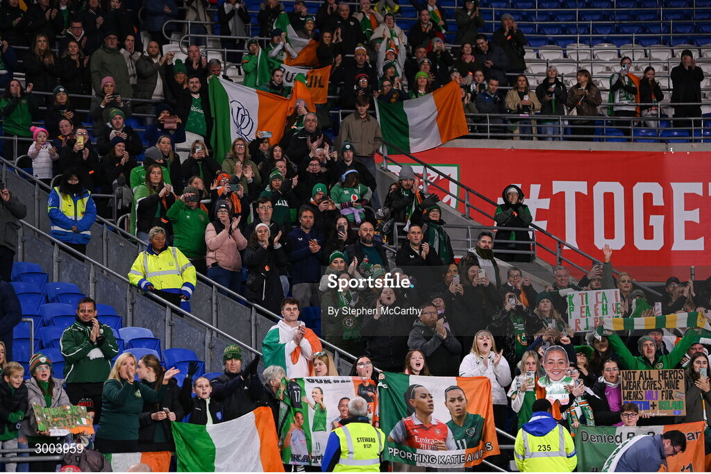 29 November 2024; Republic of Ireland supporters after the UEFA Women's EURO 2025 Play-off Round Two first leg match between Wales and Republic of Ireland at Cardiff City Stadium in Wales. Photo by Stephen McCarthy/Sportsfile