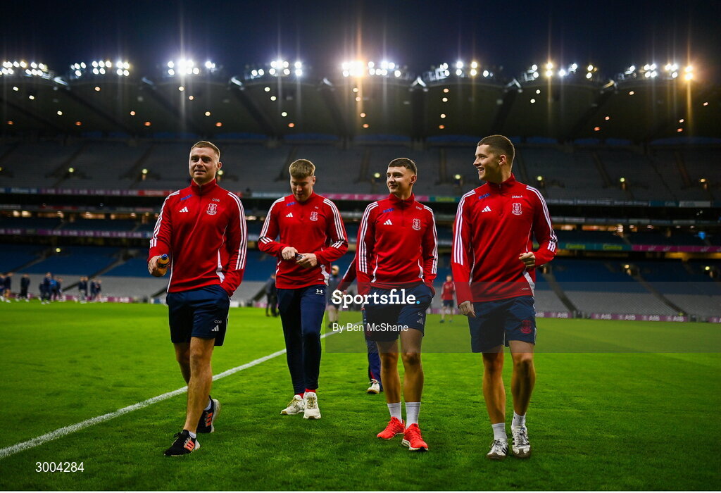 30 November 2024; Cuala players, from left, Cathal Ó Giolláin, Tom Magee, David O'Dowd and Daragh McAdam inspect the pitch before the AIB Leinster GAA Senior Club Football Championship final match between Cuala of Dublin and Ardee St Mary's of Louth at Croke Park in Dublin. Photo by Ben McShane/Sportsfile