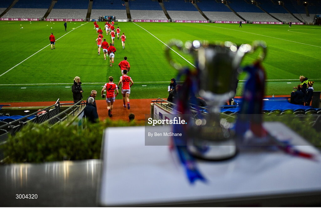 30 November 2024; Cuala players make their way to the team photograph before the AIB Leinster GAA Senior Club Football Championship final match between Cuala of Dublin and Ardee St Mary's of Louth at Croke Park in Dublin. Photo by Ben McShane/Sportsfile