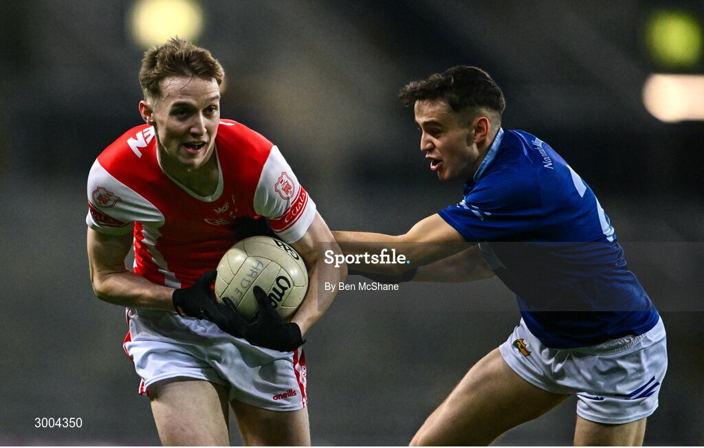 30 November 2024; Eoin Kennedy of Cuala is tackled by Tadgh McDonnell of Ardee St Mary's during the AIB Leinster GAA Senior Club Football Championship final match between Cuala of Dublin and Ardee St Mary's of Louth at Croke Park in Dublin. Photo by Ben McShane/Sportsfile