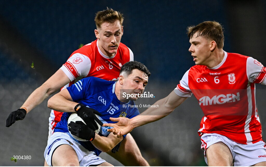 30 November 2024; Tom Jackson of Ardee St Mary's in action against Peadar Ó Cofaigh Byrne, left, and Charlie McMorrow of Cuala during the AIB Leinster GAA Senior Club Football Championship final match between Cuala of Dublin and Ardee St Mary's of Louth at Croke Park in Dublin. Photo by Piaras Ó Mídheach/Sportsfile